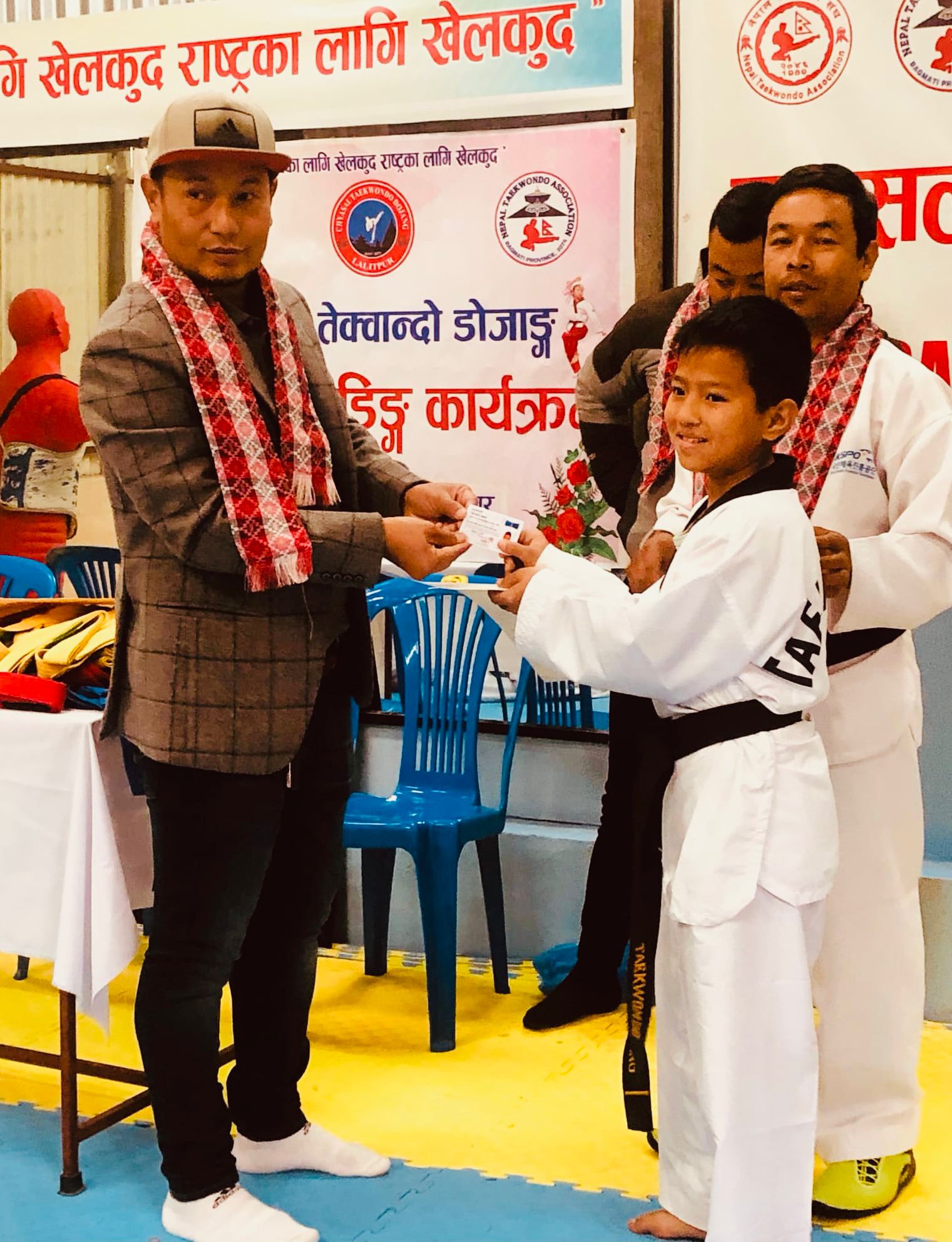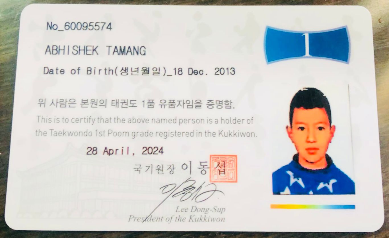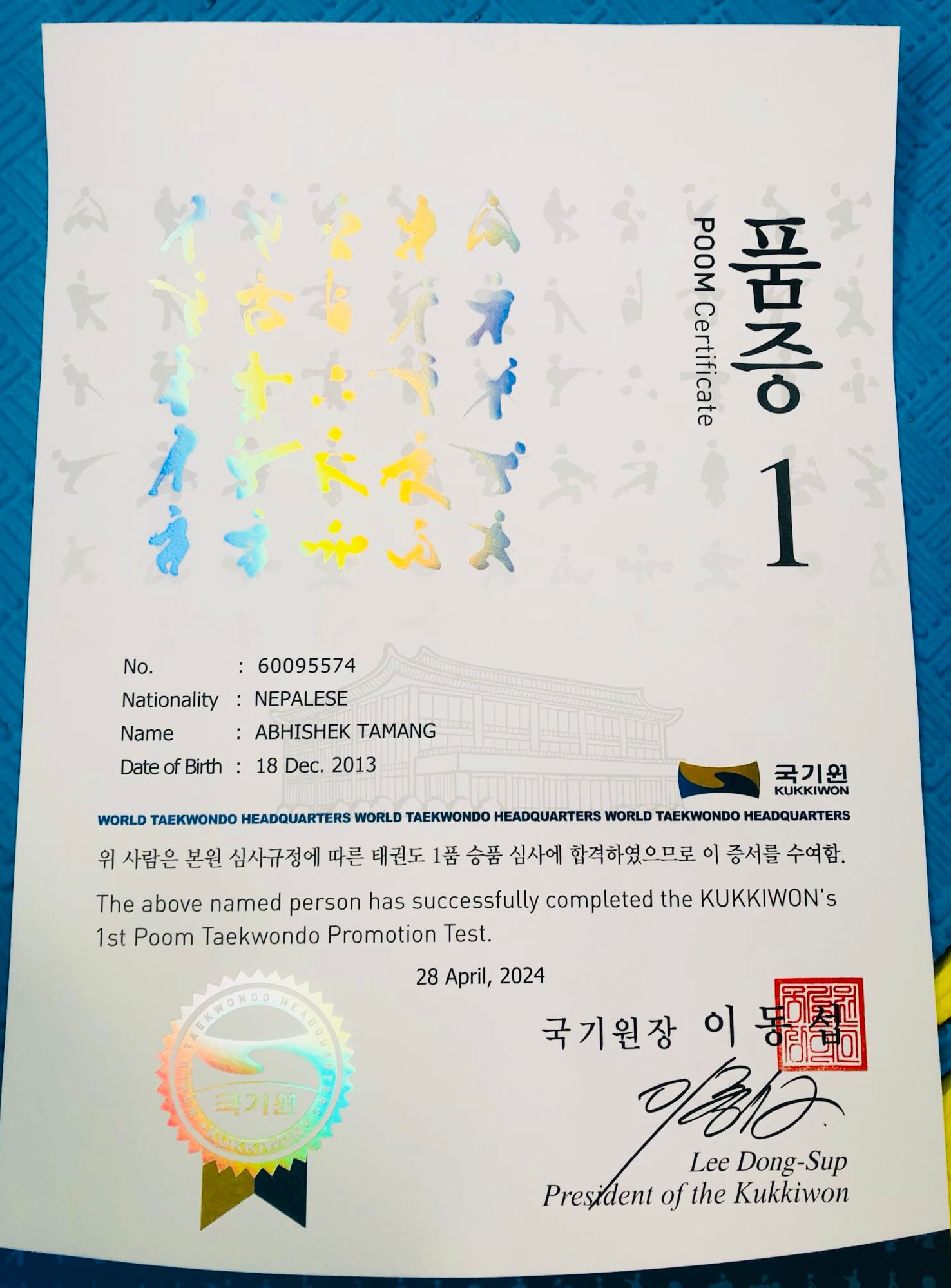 ABHISHEK TAMANG for achieving his 1st Poom in Taekwondo.